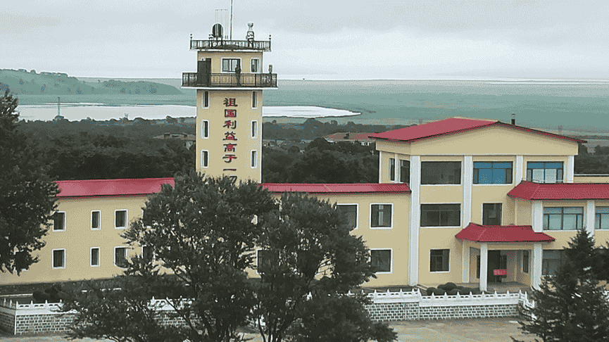 待楼上人少之后我们登上了龙虎阁顶层,先看到位于中俄边界山岗上的边防哨所,座落在江水之畔的红顶黄色的哨所大楼十分抢眼,大楼上五星红旗迎风飘扬,岗楼上"祖国利益高于一切"的大字和营房前"建设强大稳固的现代边海防"的横幅清晰可见,哨所顶楼闪现着保卫祖国坚守边疆的战士身影,国家的强盛离不开巩固的国防。这里曾有多位国家领导人来视察,慰问全体官兵。听说新的第423号界碑竖在哨所不远之处,只是军事禁地不对外开放无缘见识。而1993年中俄重新界定了边界,“土字牌"界碑作为文物供游人观赏。
