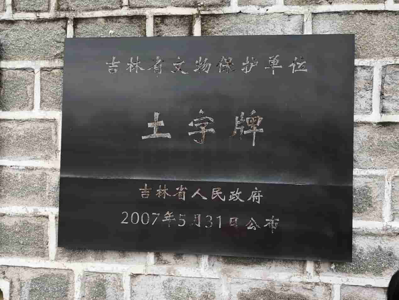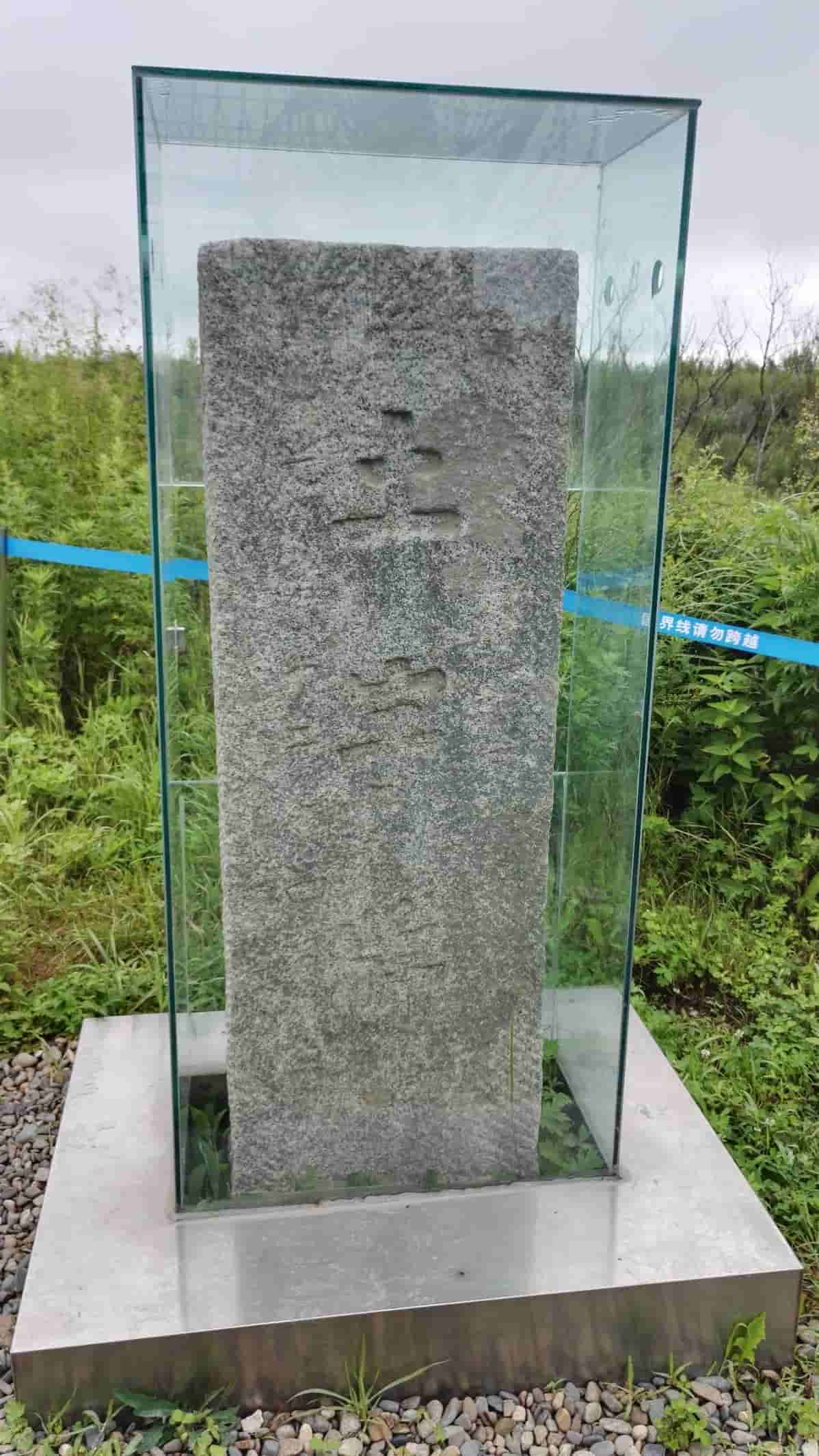 砖墙尽头处建有台阶,拾阶而上到达平台,就看到了大名鼎鼎的"土字牌"界碑。旁边还竖立着细长的俄罗斯422号界碑。土字牌全碑高1.44米,宽0.5米,厚0.22米,见证了100多年历史的花岗岩材质石碑字迹已经模糊,这几年被安放在玻璃罩中严加保护。透过玻璃还可看出碑正中竖刻有"土字牌",左侧竖刻着"光绪十二年四月立"八个小字。
