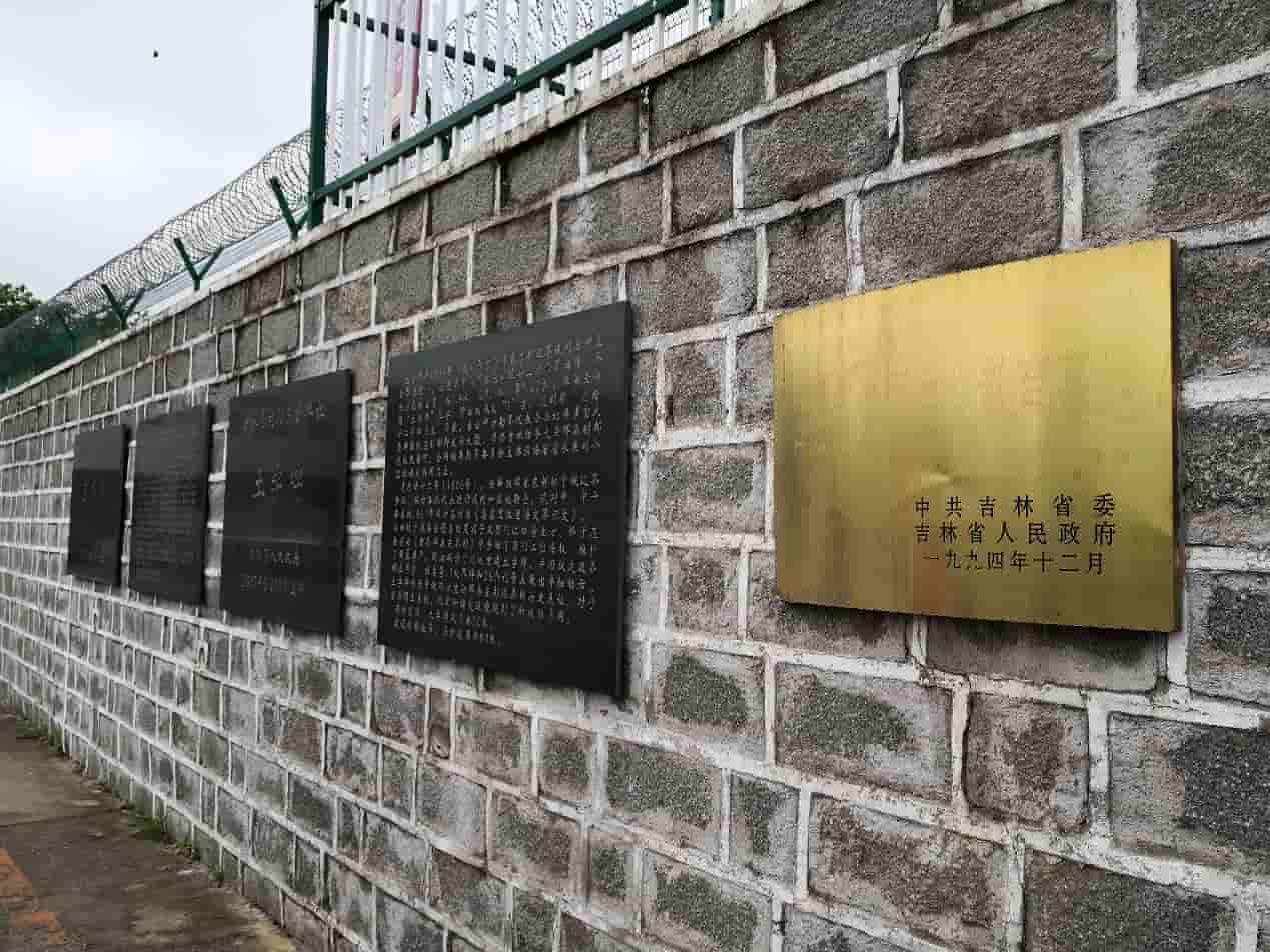 乘坐的观光车行驶在茂密的山林间,穿过一段很长很窄的林间路后到达了第一个景点土字牌界碑,下了观光车最先看到白色岗楼,这个岗楼原来也是观光景点,可以登楼观景,自从高大的望海阁修建开放后,此楼不再对外开放。岗楼旁高墙上铁丝网密布,穿过岗楼门洞后就能看到一面砌砖墙,上面镶嵌着土字牌的吉林省级文保碑,还有界碑简介、吉林省爱国主义教育基地铜牌等。砖墙上方是严密的中俄国界的铁丝网。