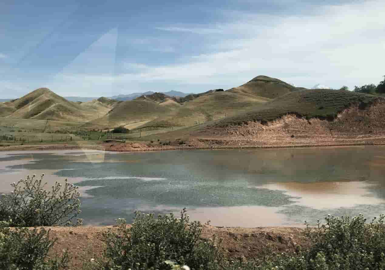 前行道路逐渐平坦,群山的色彩变得丰富,玛纳斯河水也被涂染,周边的群山的形状从嶙峋变得浑圆,这里是石河子市的紫泥泉镇,新疆农八师143团的农场和牧场。一周前在石河子原兵团总部游览,今天来到了石河子市南面,新疆的景点就是这么绕。