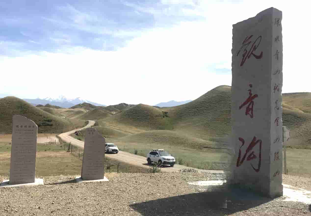前方不远竖立着"观音沟"石碑,据说当年唐僧师徒途经这里时是一片荒漠戈壁,四人人困马乏,饥渴难耐,经悟空南海求援,观音亲临把附近变得山青水秀。远眺天山深处雪山高耸,这座高达5000多米高的雪山在阳光照耀下银光闪闪,玛纳斯等多条河流都源于此山。