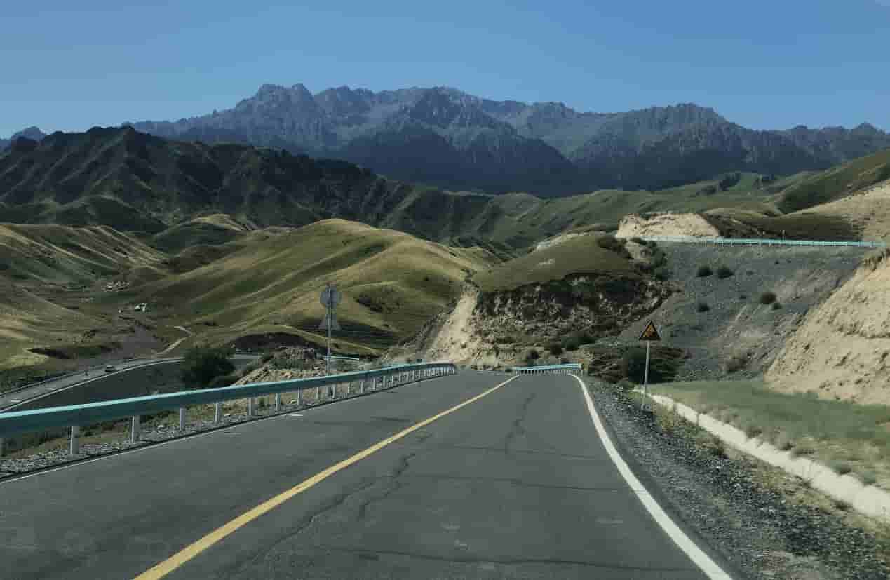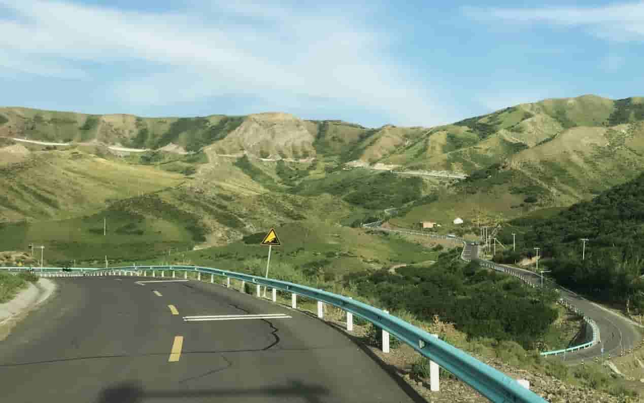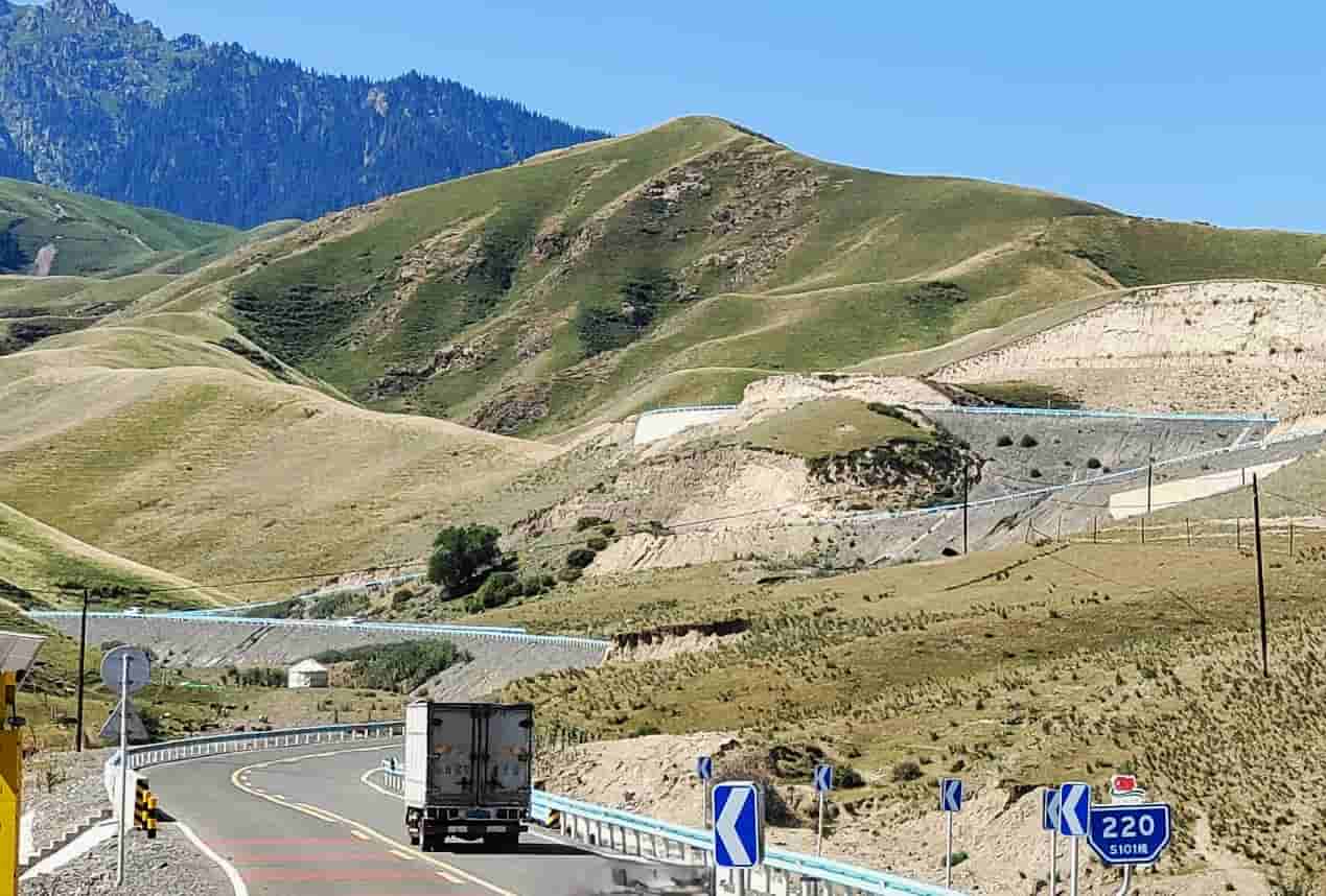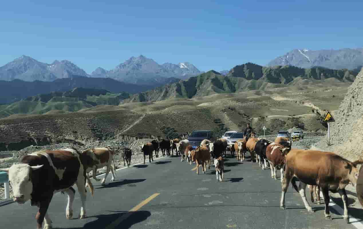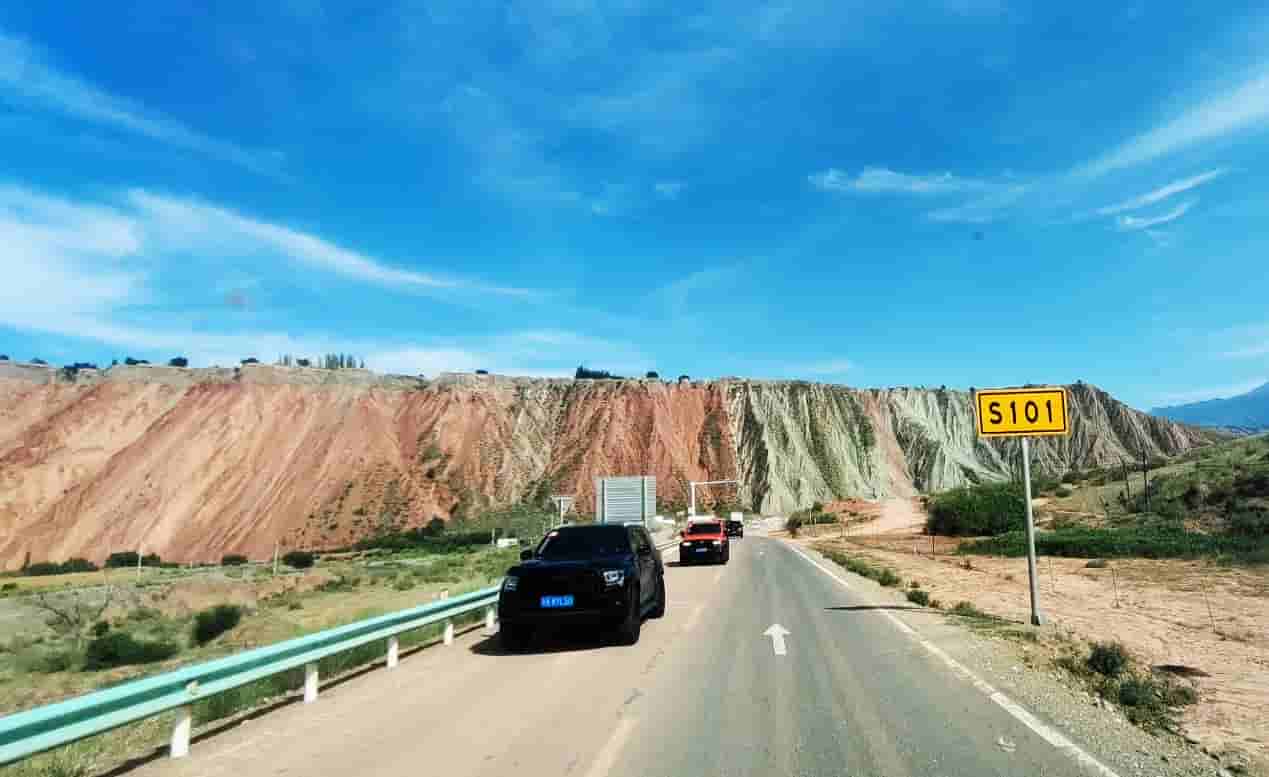 天山山脉南北平均宽约300 公里,行驶在101国道上,山外有山,峰峦叠嶂,不同的山形地貌和色彩不断变换,犹如连绵不断的画卷。道路也随之时而爬升,时而下降,也不乏急弯和盘山路,但相比独库公路和伊昭公路,惊险度平大为降低。当年简易铺装的战备公路现已是柏油路面的旅游公路,轿车也能轻松行驶。只有遇见横行路中的牛群、羊群需要耐心等待,它们没有让路的习惯。
