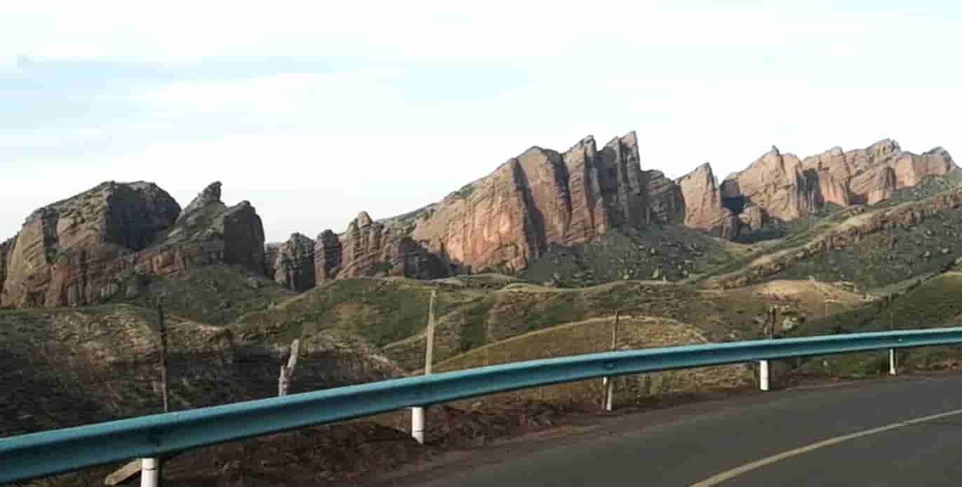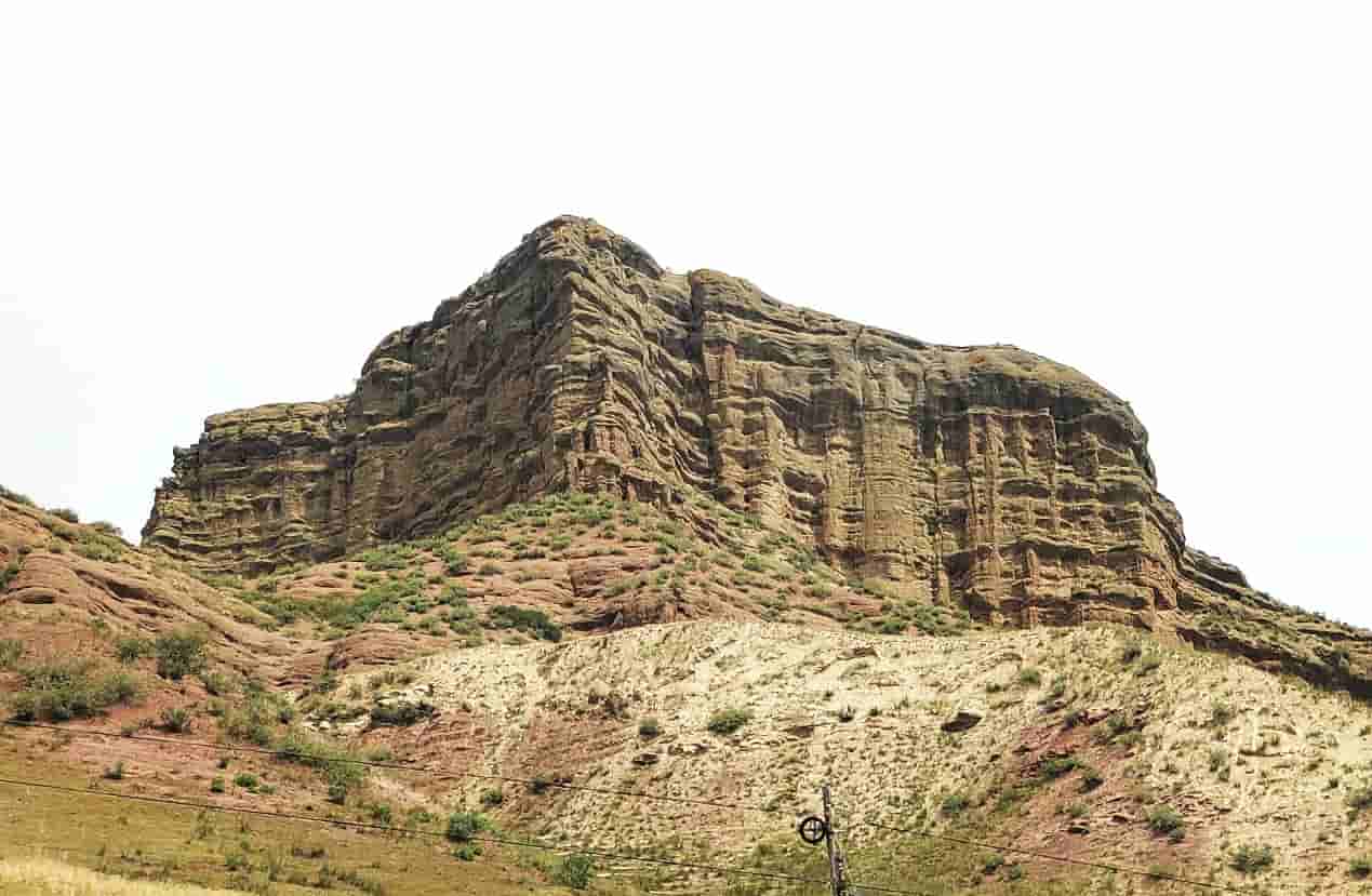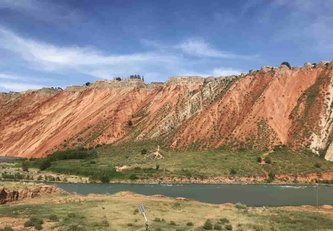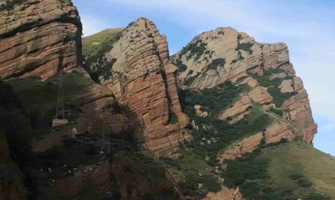 离开肯斯瓦特,盘旋在山清水秀的天山山脉终,沿途经过伟人山景点,远望山体轮廓很像伟人头枕青山仰卧,说是对面有斯大林嘴叼烟斗山形,踅摸了半天看不出来。继续向前是锦绣河山,介绍说这是形成于侏罗纪的砂岩砾岩结构,因地质作用形成了长一百多米的单斜峰丛,与底部连绵的岩丘一起,构成了锦绣山河的丹霞地貌。