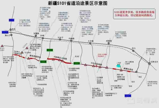 离开鹿角湾后,继续沿101省道向乌鲁木齐方向前行。S101始于乌鲁木齐,终于前天途经的观音沟,与独库公路相接,全程约300公里,是上世纪60年代为提防苏修而建的国防公路。不同于独库纵向穿越天山连接南北疆,101省道横穿天山腹地,地跨乌鲁木齐、昌吉、石河子、塔城地区的乌苏、沙湾以及奎屯市,走向平行于乌奎高速。这条公路以其壮丽的自然风光著称,被称为"天山地理风光走廊",现已成为自驾游客观光探险的打卡胜地。