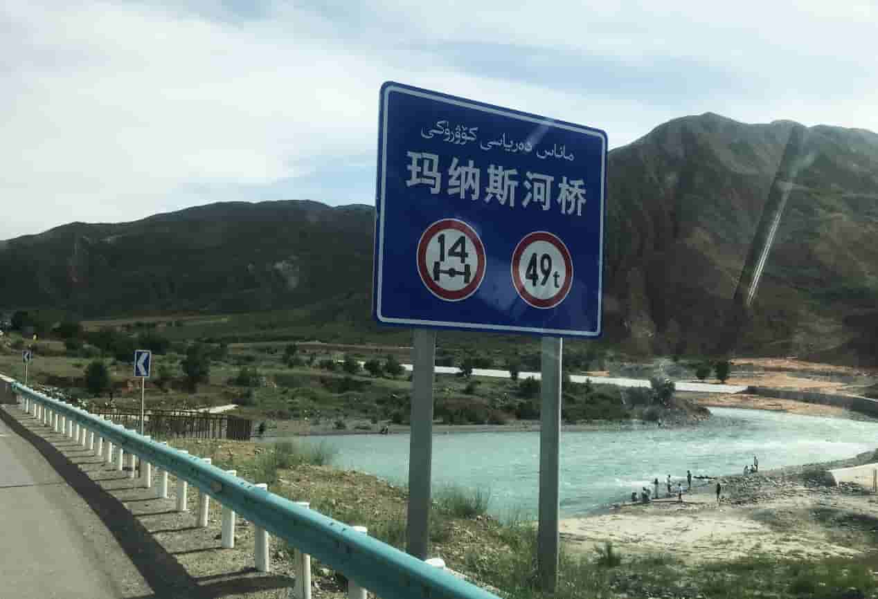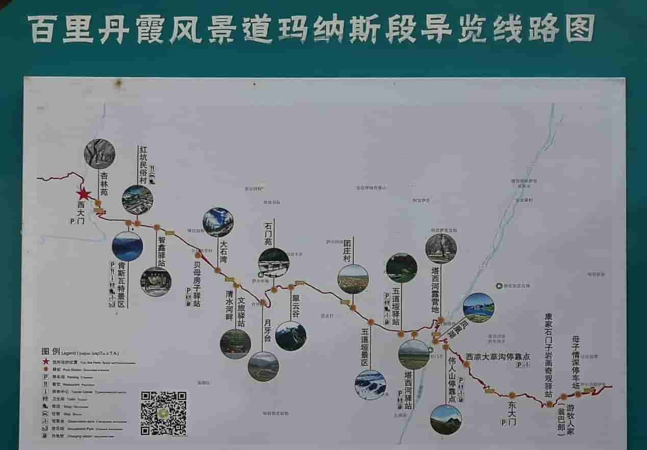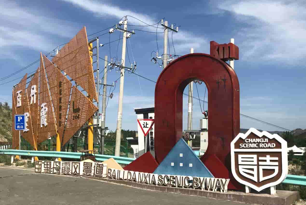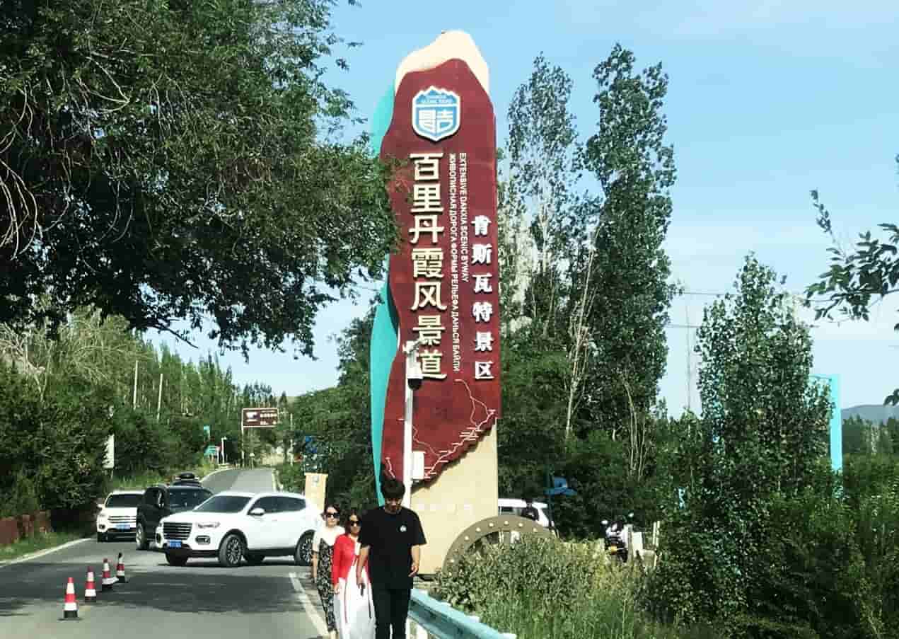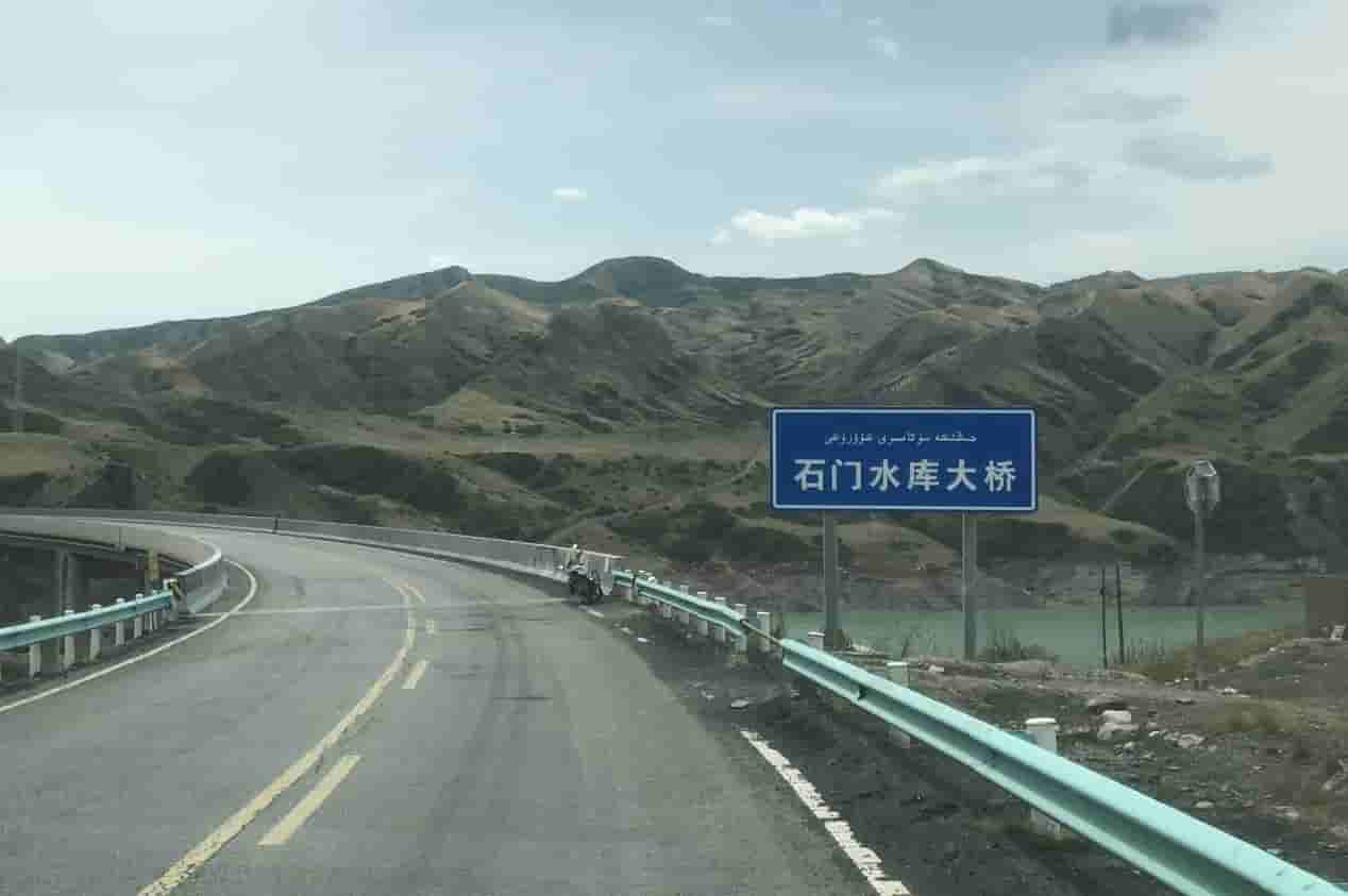 驶过大桥进入昌吉市所属的玛纳斯县境。百里丹霞风景道0公里的标牌竖立在路边,101省道百里丹霞景区位于新疆昌吉州,全长146公里,地跨越昌吉市、呼图壁县和玛纳斯县的南部山区,东起昌吉市硫磺沟镇,西至玛纳斯县肯斯瓦特水库, 标牌对面就是水库入口。