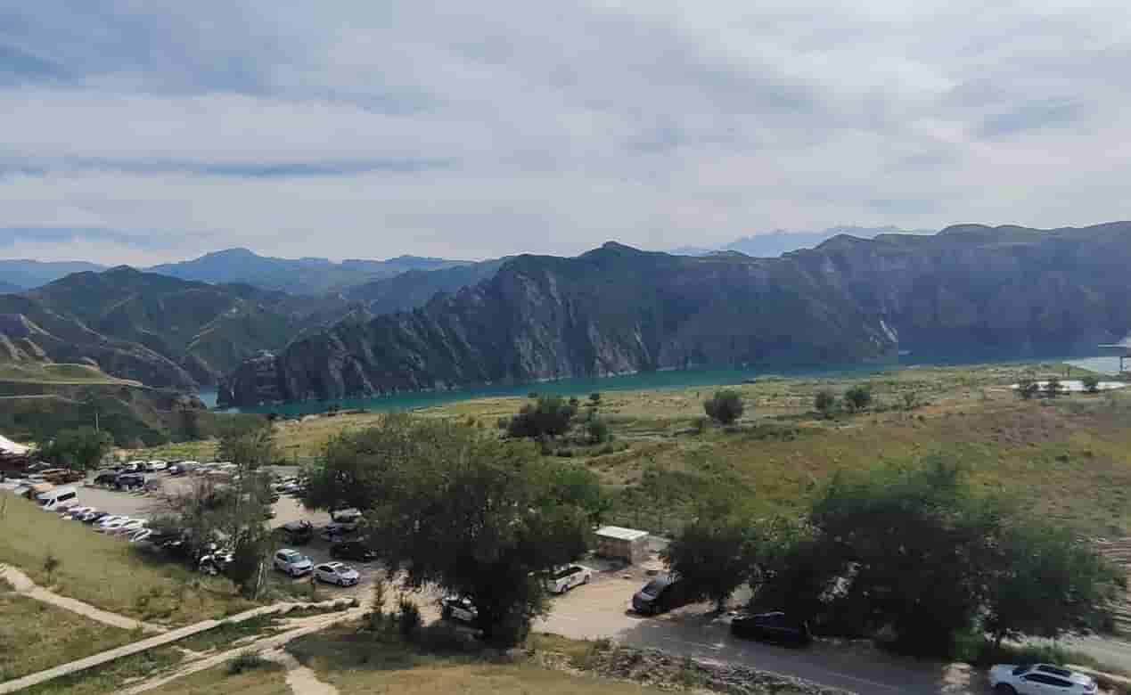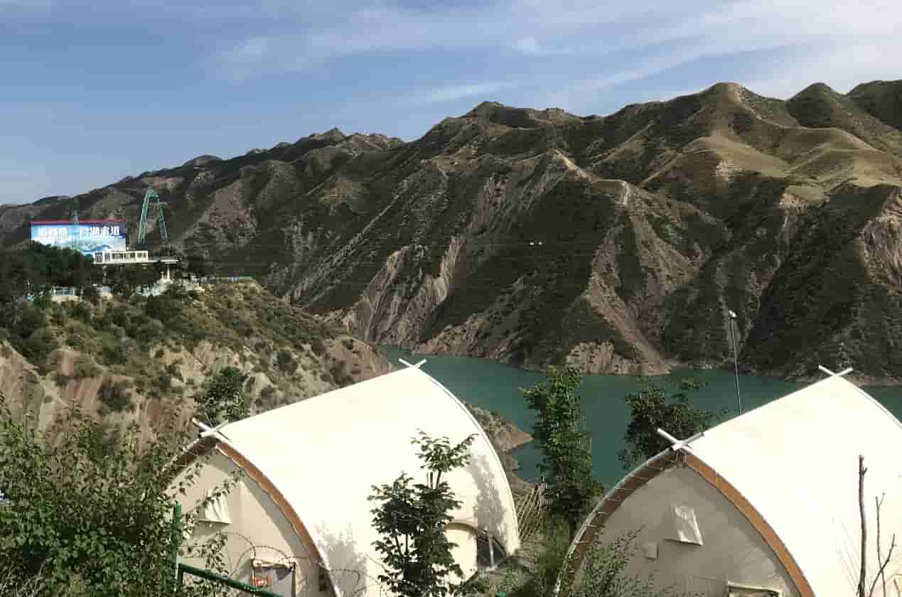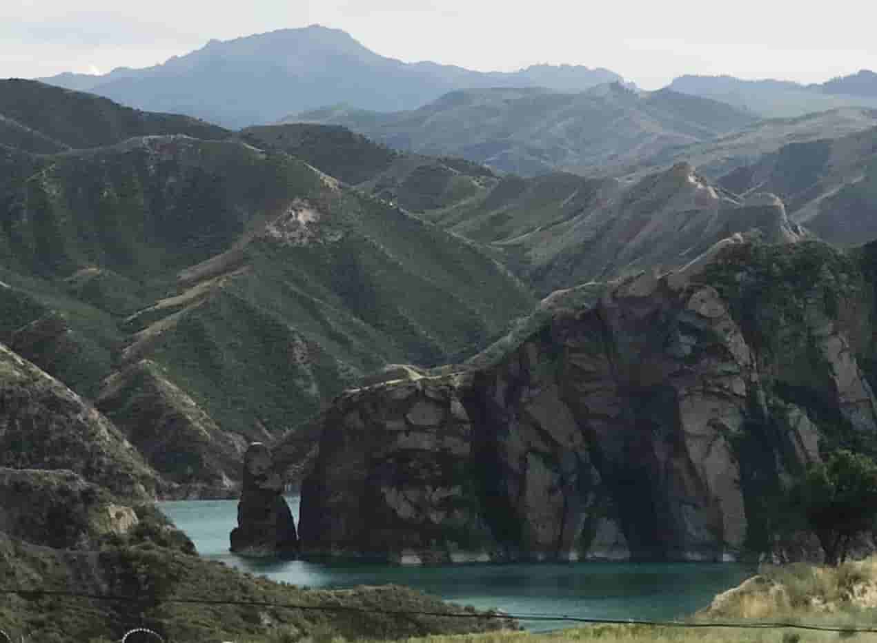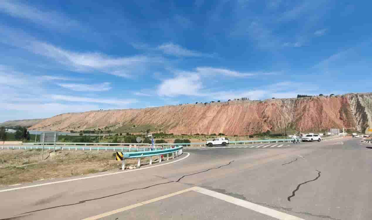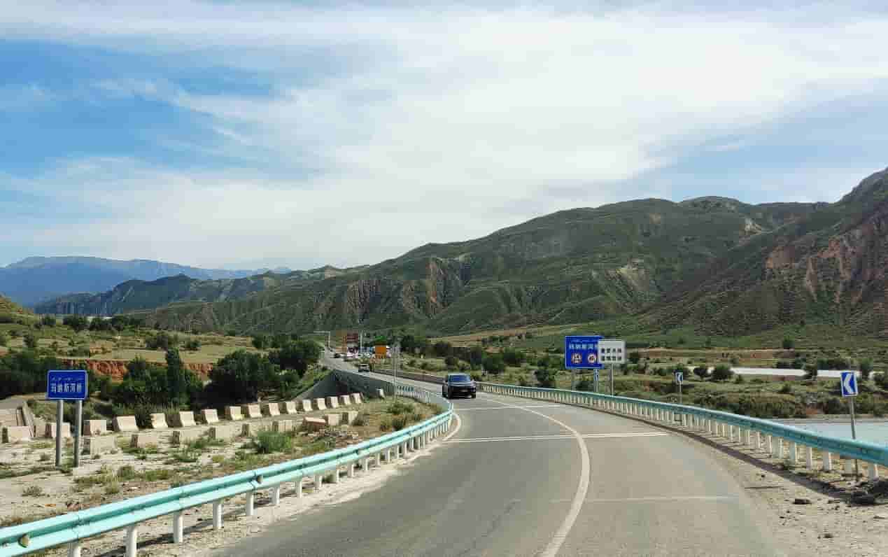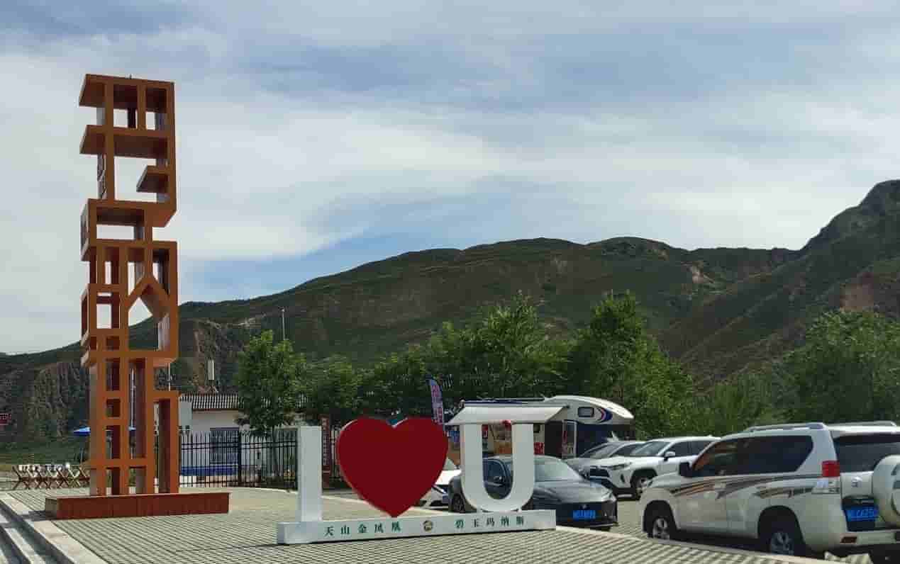 驶过大桥进入昌吉市所属的玛纳斯县境。百里丹霞风景道0公里的标牌竖立在路边,101省道百里丹霞景区位于新疆昌吉州,全长146公里,地跨越昌吉市、呼图壁县和玛纳斯县的南部山区,东起昌吉市硫磺沟镇,西至玛纳斯县肯斯瓦特水库, 标牌对面就是水库入口。