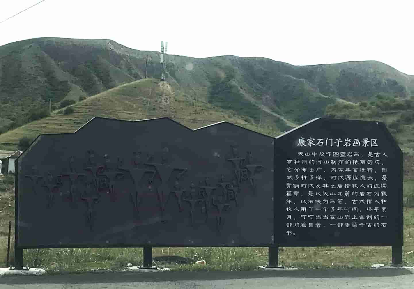 101省道以自然风光取胜,人文景点很少,唯有康家石门子岩画景区,内有国内及世界上罕见的生殖崇拜岩画,真实地体现了原始人祈求生育、繁衍人口的群婚制生活场面。岩画是3000多年前游牧民族塞种人留下的遗迹,他们从遥远的黑海来到这里建立牧场,在新疆多地生活数千年,有多个部落被大月氏人打败逃到伊朗等地。几年前在南疆见过的若羌 “楼兰美女”,据说也是塞种人。听说岩画景点地处深山,道路崎岖险恶且暂停开放,看了看岩画宣传板作罢。