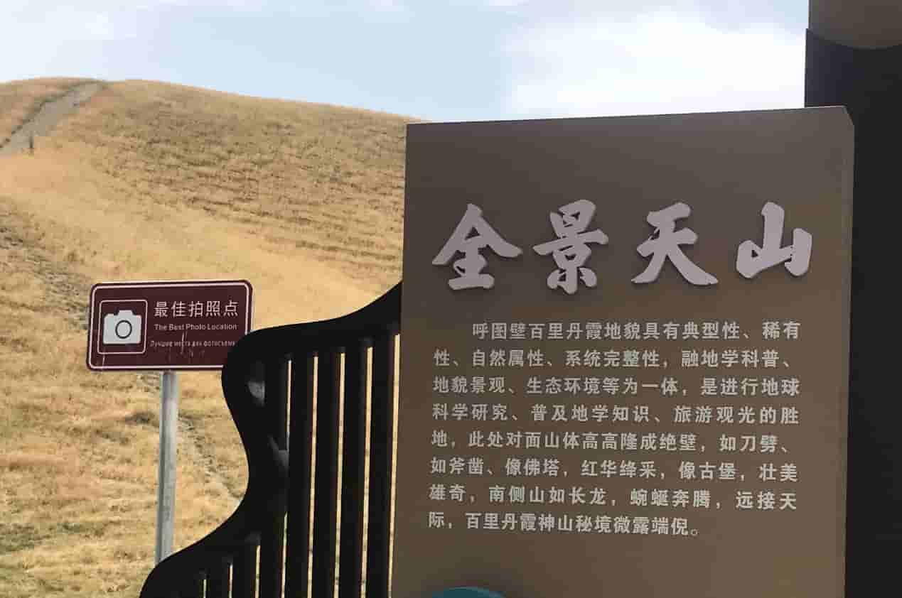 过桥后不远是地势较高的全景天山停车点,在这里登高望远,或行驶在周边,可以看到雪山、草原、戈壁、河流、丹霞和雅丹等多种地形地貌,处处展现出百里丹霞作为天山的一颗明珠,恢弘壮丽,波澜壮阔的景象。