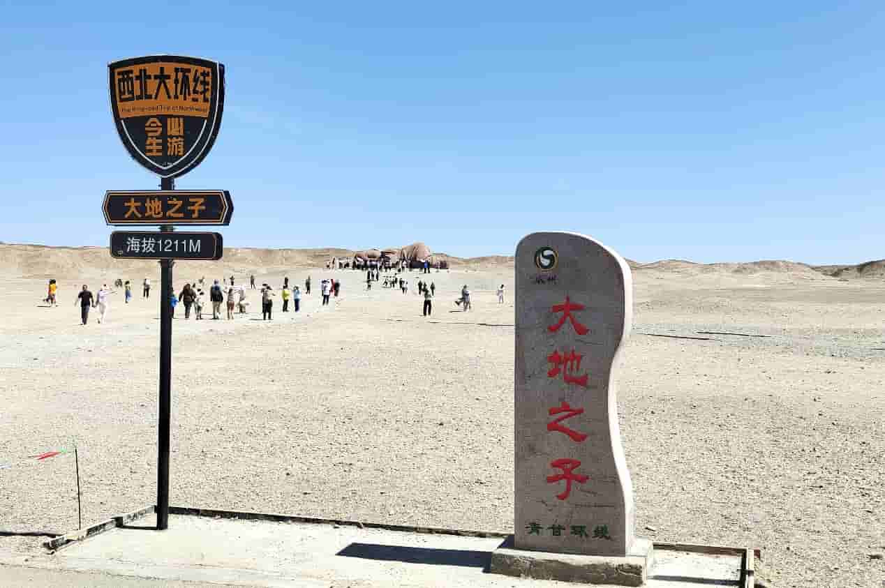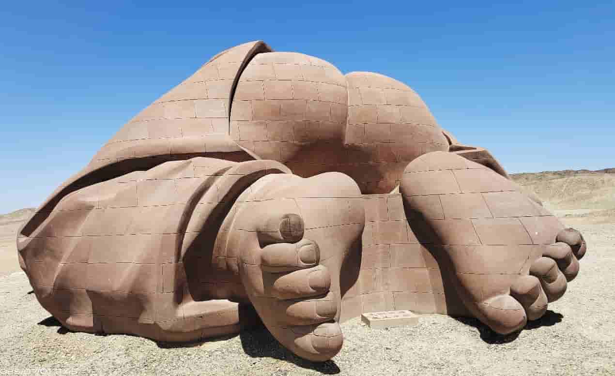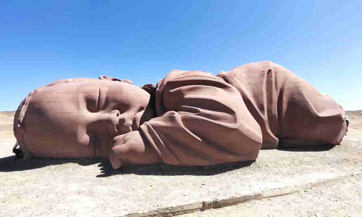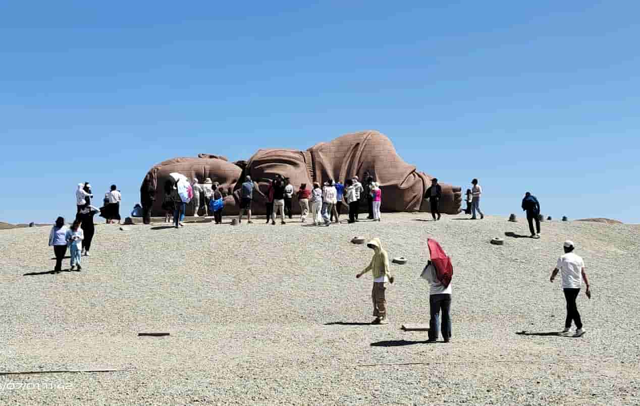 瓜州雕塑群中首件作品《大地之子》名气最大,它由清华大学美术学院新疆籍董书兵教授创作,于2016年率先落成于大漠戈壁中。塑像高4.3米、长15米、宽9米,以红砂岩为主要材质,和《汉武雄风》一样,通过3D技术建模、分块雕刻,然后逐块雕砌安装成型。人群从专用停车场走向景区,棕红色的巨大婴儿雕塑恬然入睡,趴伏在广阔天地怀抱中。走到跟前可以看出塑像由无数个模块拼接而成,一只眼睛就需要6块。孩童憨态可掬,形象生动,每个侧面都刻画的精细入微,惹得游客纷纷打卡留念,好不容易抢得一幅干净画面。