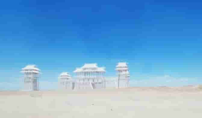 另一处现代派的钢结构《无界》雕塑,据说取材自榆林窟壁画,采用数千根钢管搭建成古代宫阙轮廓,远看很像海市蜃楼朦胧的幻影。