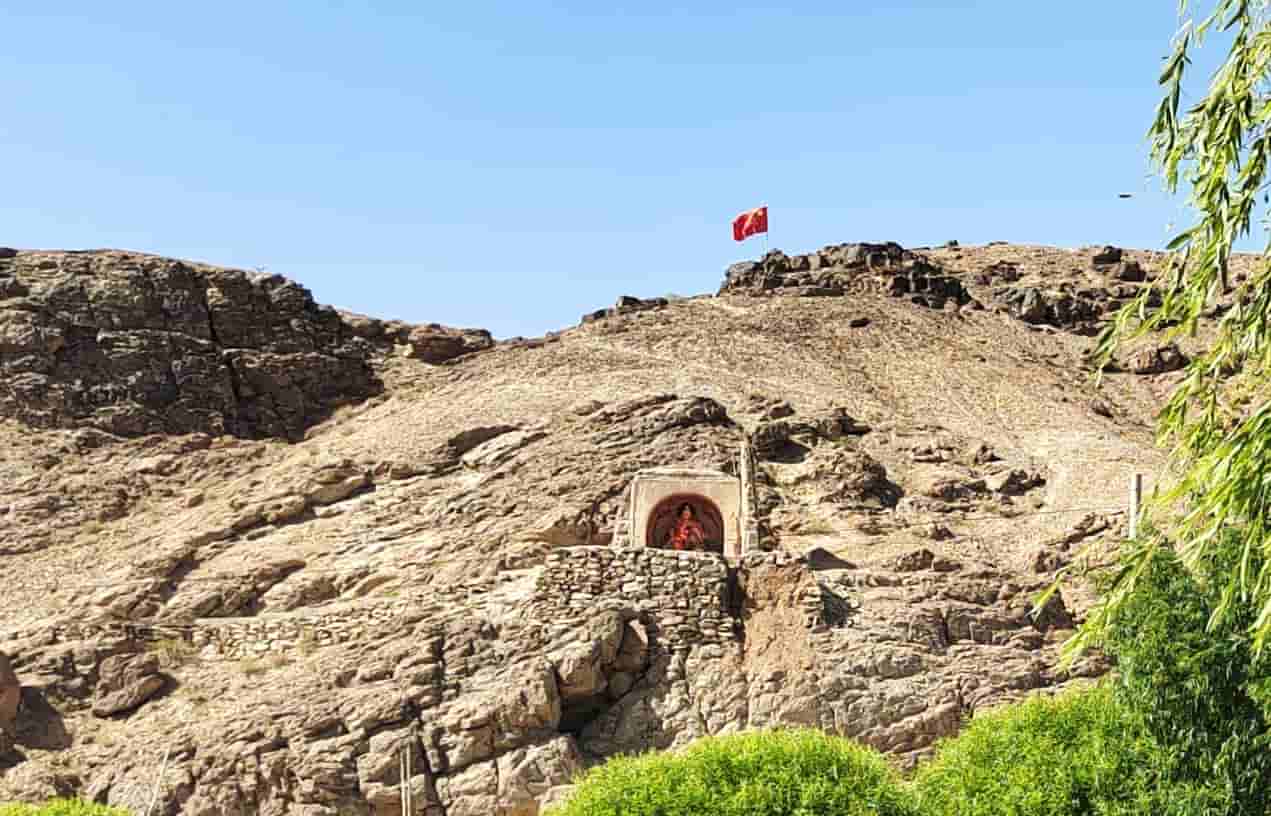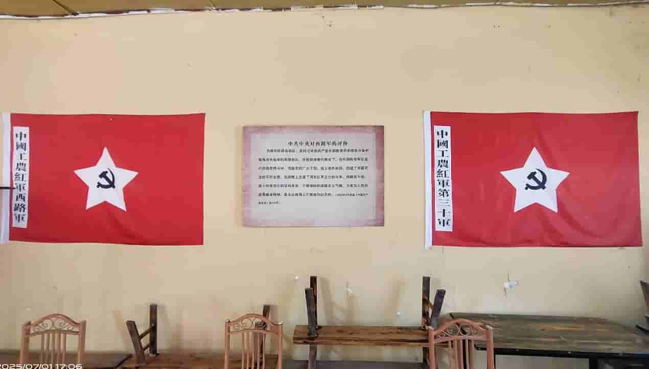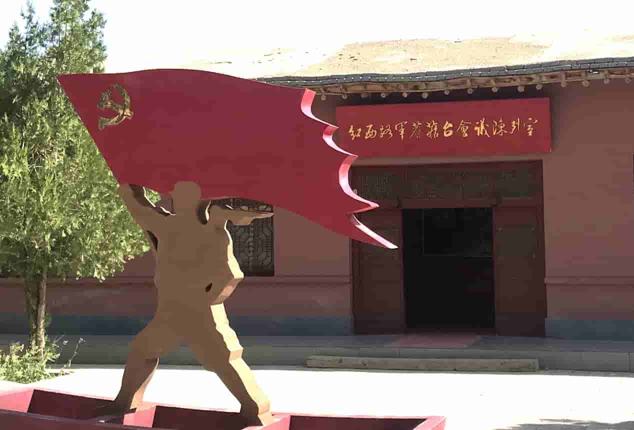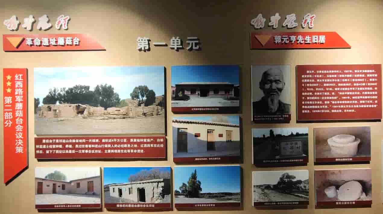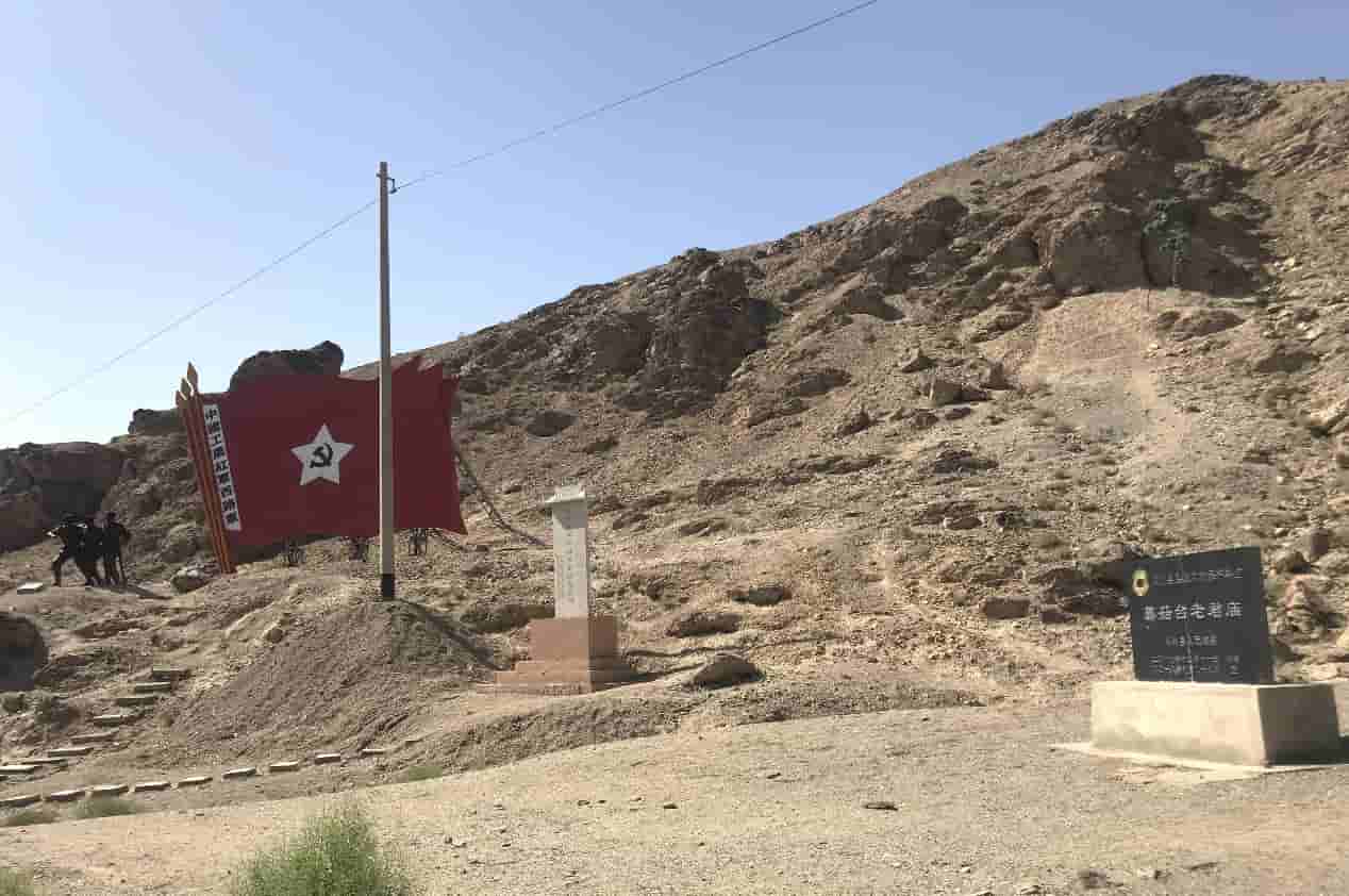 继续前行发现山坡上立有石碑还有西路军红旗。1937年4月红军西路军余部抵达这里休整,并召开了西路军西征以来最后一次军事会议。这里名为蘑菇台子,原是榆林窟的庙产,山上现有一座老君庙作为瓜州文物留存,原住房改为为西路军蘑菇台会议纪念陈列室,以遗物、图文等形式介绍西路军出征始末,和在瓜州的史实。