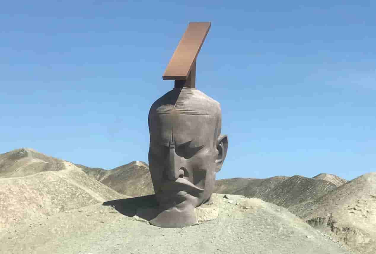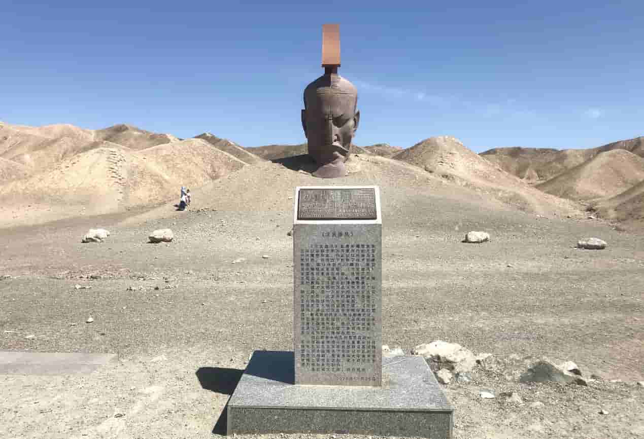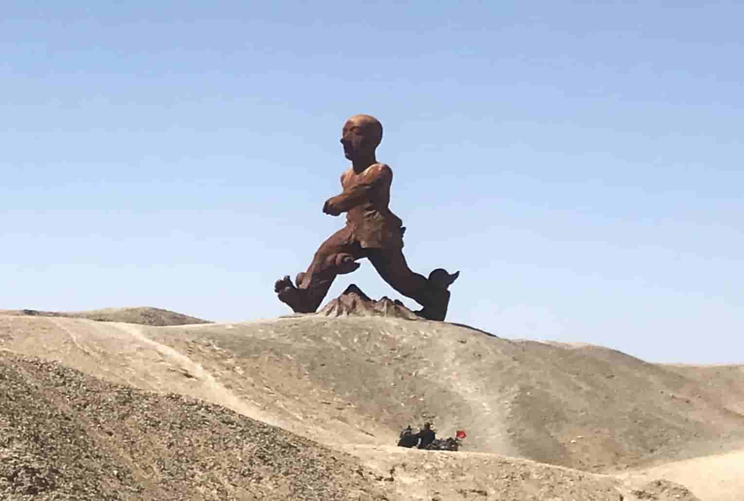 建在茫茫戈壁上的雕像群别具特色。矗立在荒漠山丘之上的汉武帝头像横空出世,身躯融入祁连山中,神态威严目光如炬。据记载汉武帝在河西走廊 “列四郡据两关”,却只派了百余官兵镇守。周边诸国皆怵于匈奴被灭前车之鉴,惟汉官之命是从,无人敢反。汉武帝不怒自威,凛然不可侵犯的形象,在《汉武雄风》上表露无遗。《跨域祁连》高9米跨度12米,卡通人像昂首阔步跨越脚下的祁连山脉,展现出先人打通丝路的豪迈和无畏。